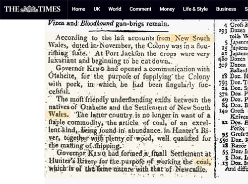 The most friendly understanding exists between the natives of Otaheite and the Settlement of New South Wales. The latter country is no longer in want of a staple commodity, the article of coal, of an excellent kind, being found in abundance, in Hunter’s River, together with plenty of wood, well qualified for the masting of shipping.Governor King had formed a small settlement at Hunter’s River, for the purpose of working the coal, which is the same nature with that of Newcastle.”