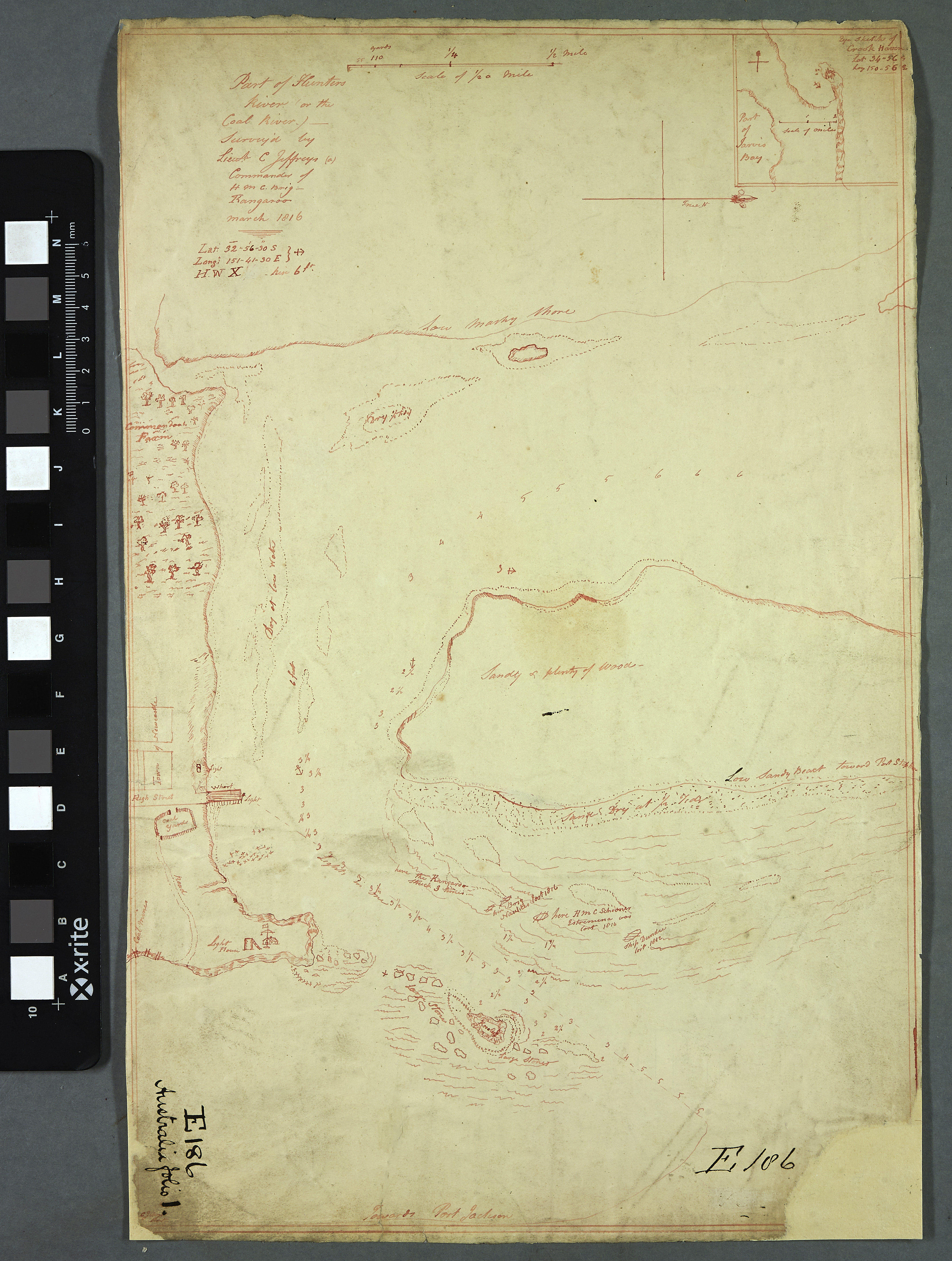 The Linen copy has a misspelling of “Jeffries” and is missing details recorded on the original of the Coal Mines, a note on a shoal, and the inset of the Jervis Bay is omitted.