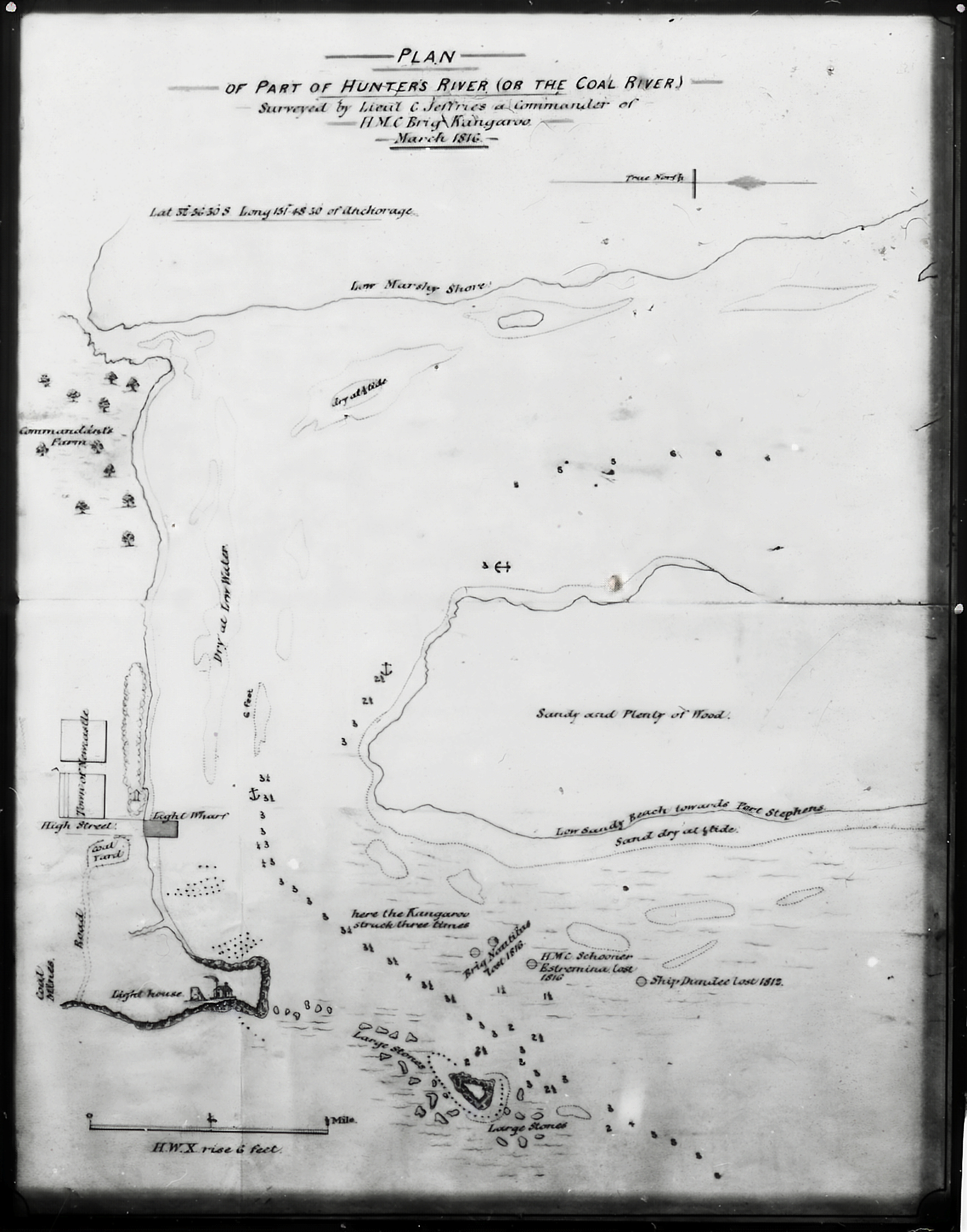 The original chart (below), in red ink, titled Part of Hunters River (or the Coal River) – Survey’d by Lieut. C Jeffreys (a) Commander of H M C. Brig – Kangaroo March 1816 is located at the Hydrographic Office in London, where all the important mapping of the British Empire are held. We thank the Hydrographic Office for providing a digital copy for us.