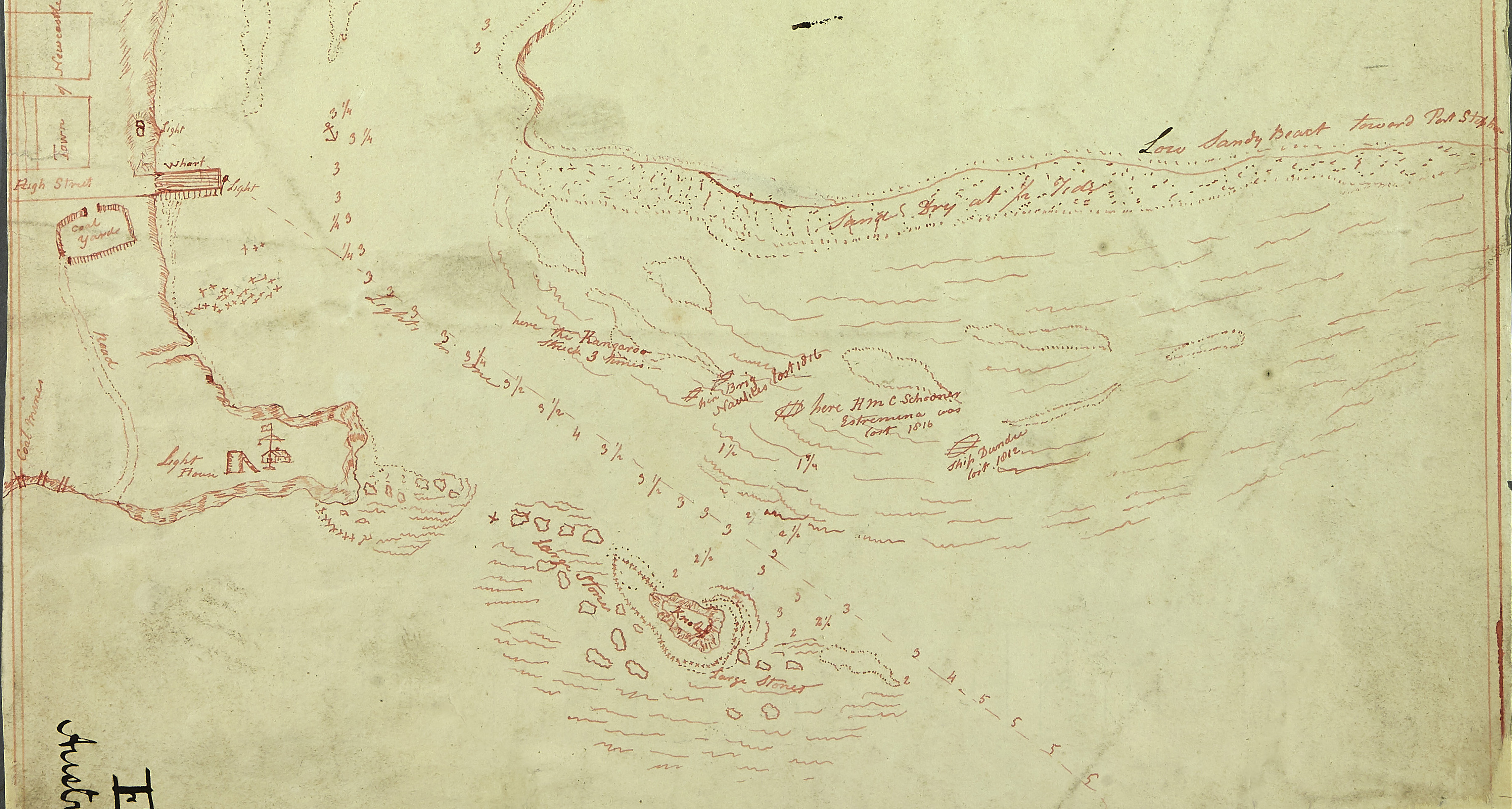 “WRECK OF THE ESTRAMINA AND THE ELIZABRTH AND MARY ON STOCKTON IN 1816In southerly or south-easterly gales or when the weather indicates the approach of such gales, the coast of Newcastle is dangerous, as the course from Broken Bay to Port Stephens is a dangerous lee shore on which the sea rolls heavily home, even to a distance of two miles from the beach. Extreme caution is requisite going in and out of Newcastle harbour. On January 14th, 1816, the Government schooner Estramina, of 120 tons, and Mr. Thomas Underwood’s schooner Elizabeth and Mary, of 86 tons, went both ashore near the entrance to the river, and were wrecked. The two vessels sailed from the river in company, the former with coals and cedar and the latter with coals only, for Sydney. The Elizabeth and Mary in standing over to the North Shore, as Stockton was called in the early days, and in the act of staying got stern way and hung aft. At the time there was a strong north-east wind and ebb tide and Captain James Gordon found it impossible to get her anchor out in the bent, consequently she became stranded. Captain Gordon’s men eventually towed her off, but she broke away her rudder and stove in part of her counter, when the heavy surf dashed her on to the point again. She then filled, and was driven high up on shore in a wrecked condition. Within five minutes of the Elizabeth and Mary’s first striking, the Government schooner Estramina was driven on shore a little to the windward. All efforts to save her drifting ashore were ineffectual, and she soon filled. At seven p.m. the seas broke clean over her, and she upset. During the night the beach became strewn with her wreckage. Lieutenant Thompson, the commandant, with a number of Newcastle residents, witnessed the two wrecks, and performed signal services by which the lives of the crews of the vessels and some cargo were saved. At first it was thought the Elizabeth and Mary could be preserved, but the heavy seas soon broke her up. She originally belonged to Samuel Thorley and Jonathan Griffiths, who sold her to Mr. Underwood, who lost many of his vessels in the river trade. “- Ref: – History of Newcastle AND THE Northern District. (1898, March 11). Newcastle Morning Herald and Miners’ Advocate (NSW : 1876 – 1954), p. 7. Retrieved May 22, 2024, from http://nla.gov.au/nla.news-article137054507 <http://nla.gov.au/nla.news-article137054507>