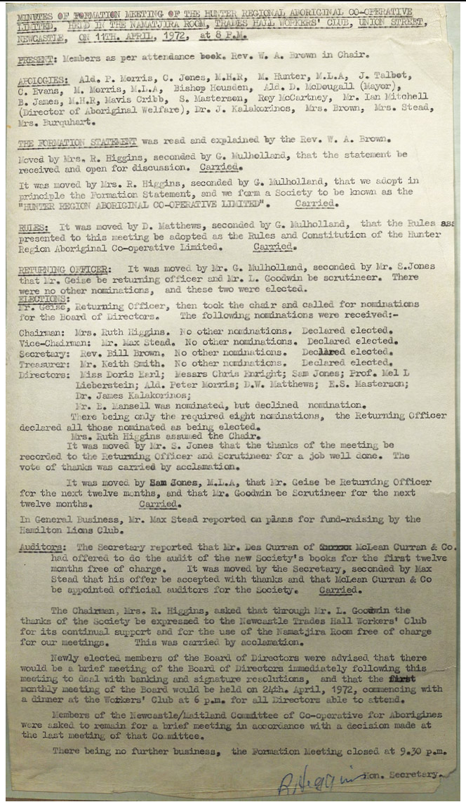 C4309 (ii) [The Riven Individual File] File containing copies of agenda, minutes, papers relating to Hunter Region Aboriginal Co-operative Limited, from its inception as proposal from the Newcastle/Maitland Committee of Co-Operative For Aborigines Limited on the 1/2/1972 to 21/11/1977. With notice of General Meeting, 16 May 1978.