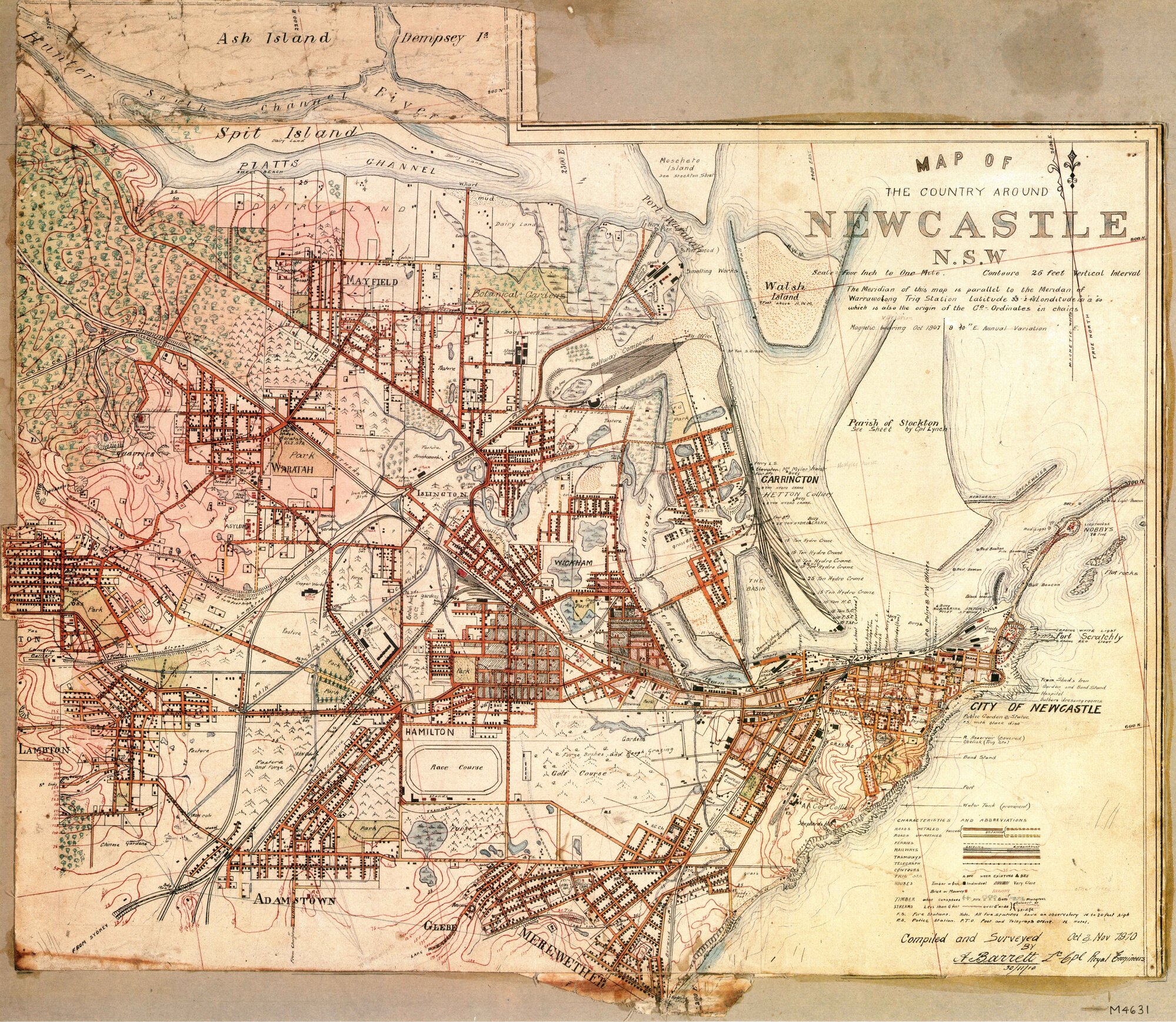 Map of the Country around Newcastle N.S.W. Surveyed by Lc Cpl A.. Barrett, Royal Engineers. October – November 1910. Shows the five islands, Harbour details and suburbs of Newcastle.