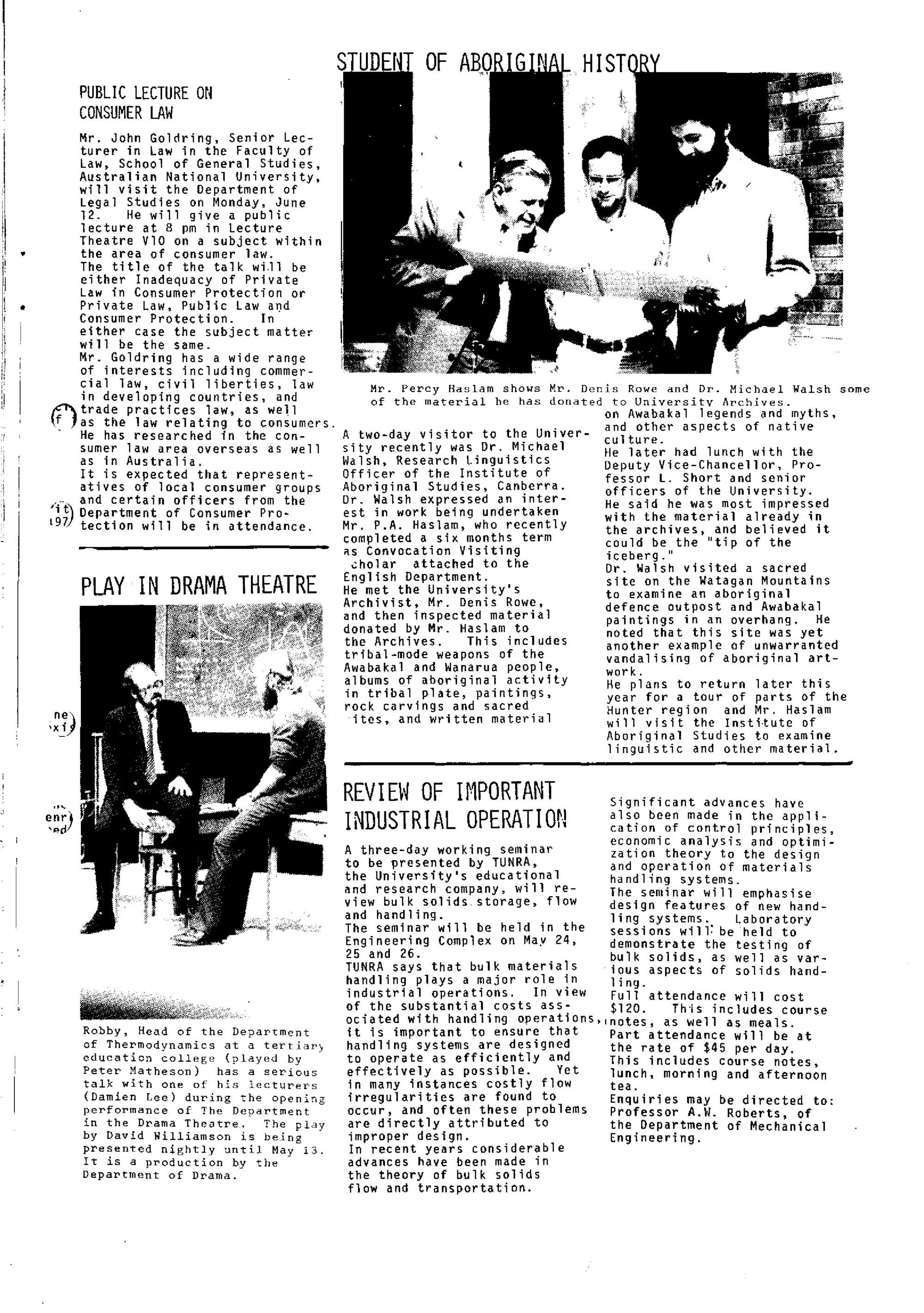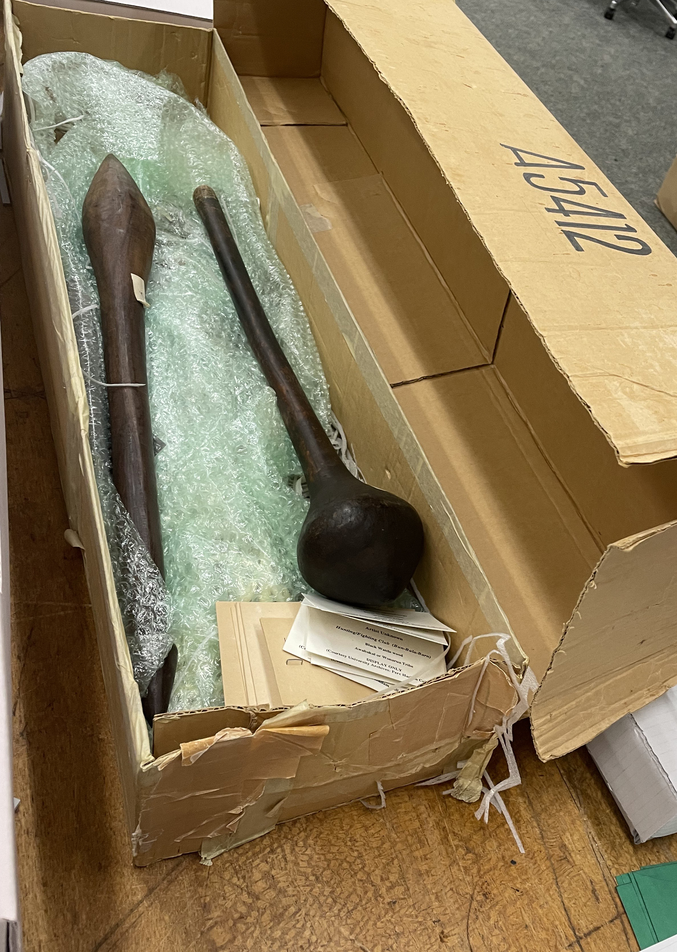 Three years after the establishment of the University Archives in the Auchmuty Library in 1975, along with Haslam’s papers, these artefacts were donated to the University Archives in April 1978 following his six-month term as a Convocation Visiting Scholar with the English Department researching Aboriginal dreaming, history, culture, and language. He came to the University of Newcastle after retiring from the Newcastle Herald, where he had worked for forty-four years as its industrial and political roundsman and associate editor.