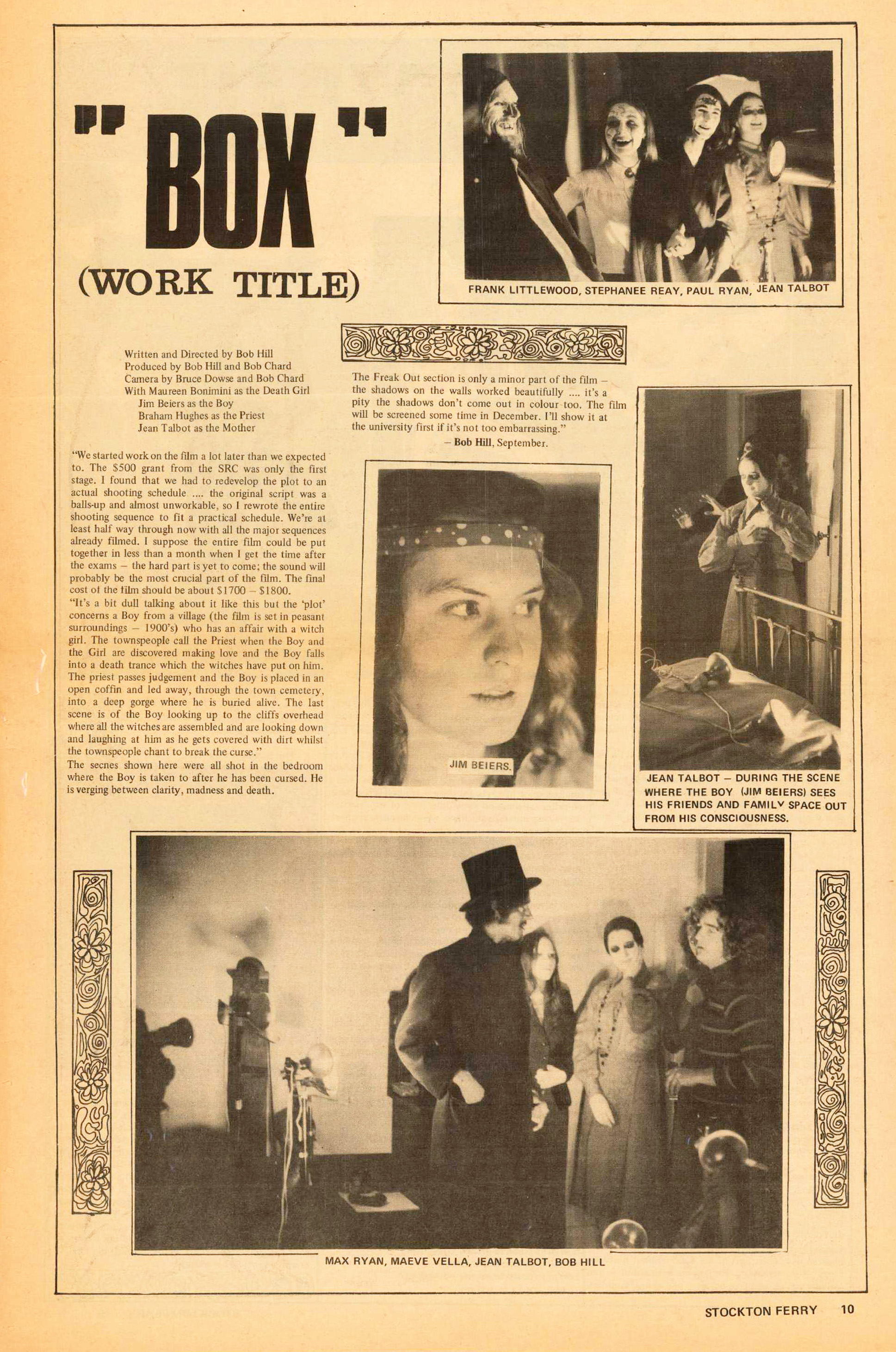 “Box” (Work Title) contained information and stills from the production shoot from the “Stockton Ferry” (October 1970) page 10 (a.k.a. OPUS).