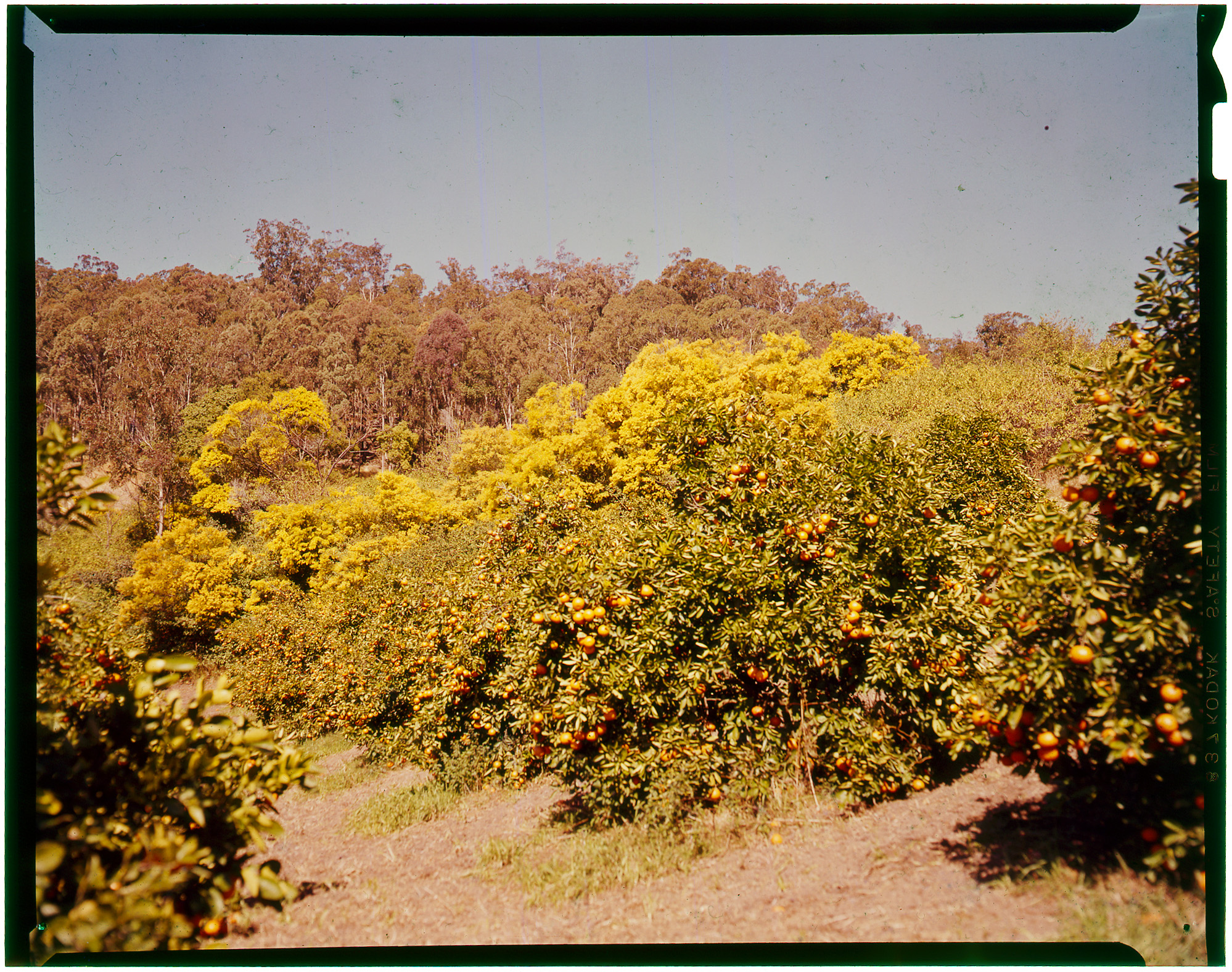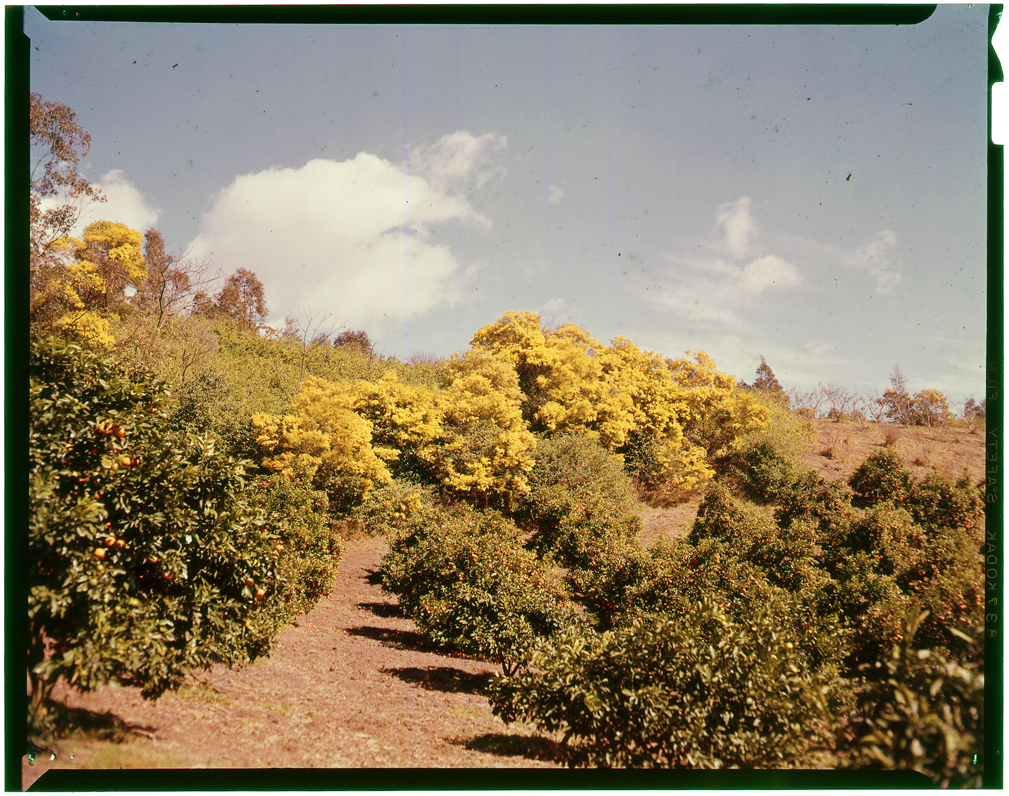 After the early mandarines are finished the whole area near the orchards, blossoms out into a great mass of golden blooms from a species of wattle known as Acacia fimbriata, literally painting the hilside gold. To add to this at Mr Osborne’s orchard “Midway” another unusual citrus variety adds its bit of gold to the picture. These are the Tangelos a cross between a Grape Fruit and a Mandarine, but these are a product of California.